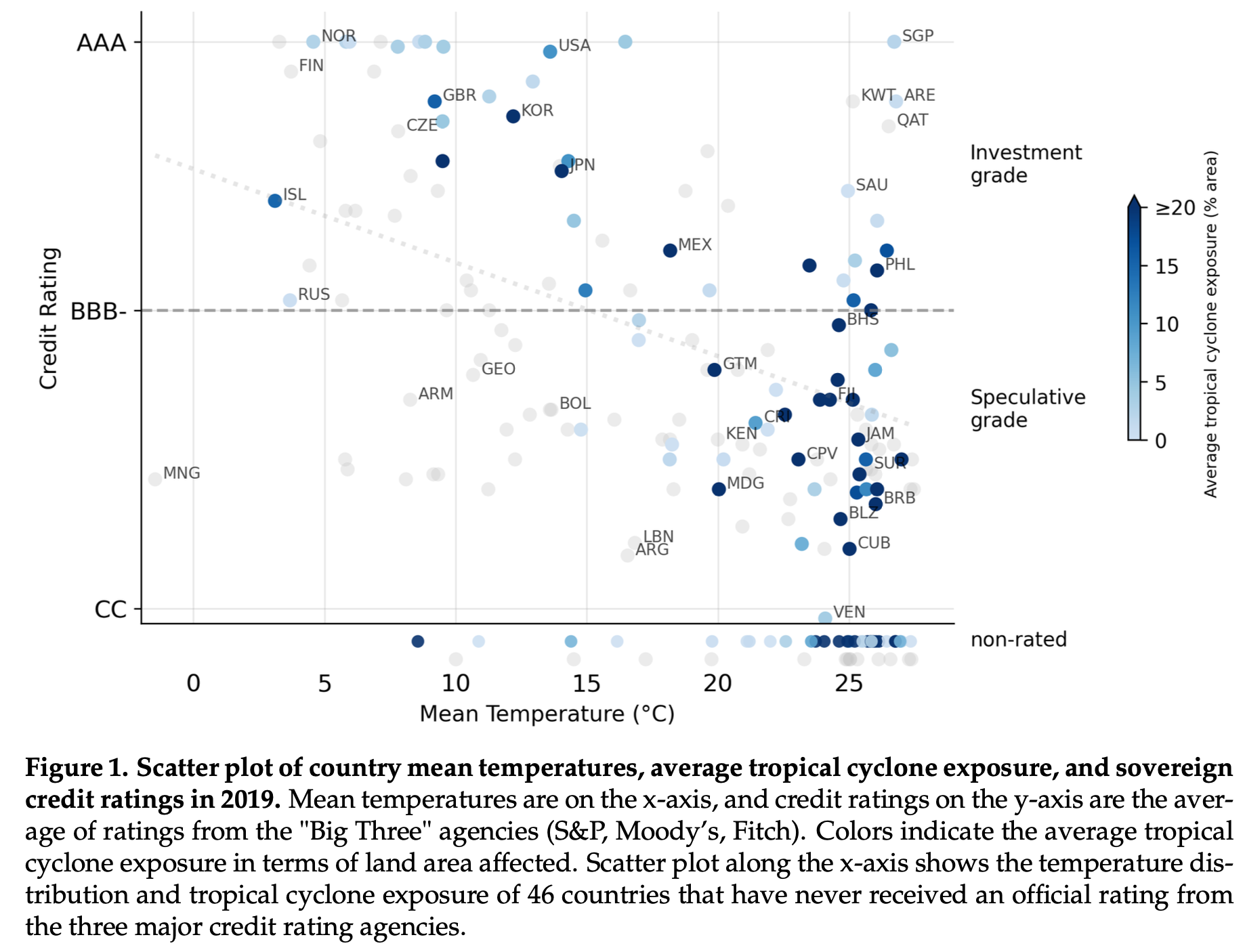 We find that historical exposure to tropical cyclones and warming temperatures has already shaped countries’ sovereign debt, credit ratings, and borrowing costs.